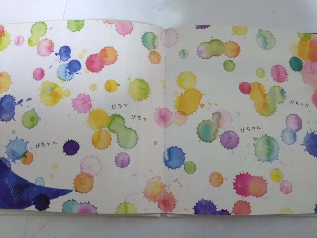 絵本の中では「ちくちく」「びちょんぴちょん」といった擬音を、色や形で表現されており、